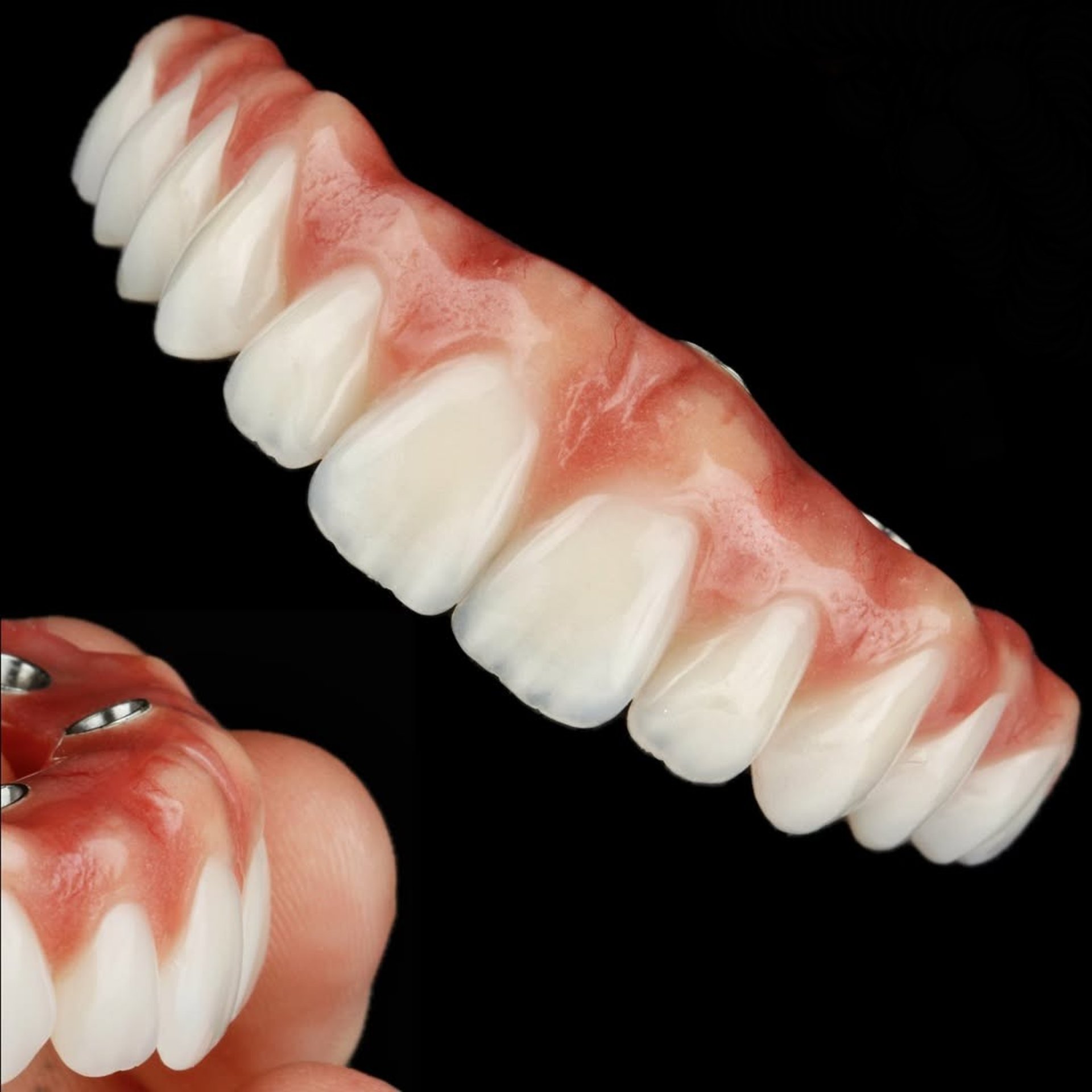 Fase protética: após fixação dos implantes, confeccionamos a prótese fixa no mesmo dia, que será aparafusada com precisão.